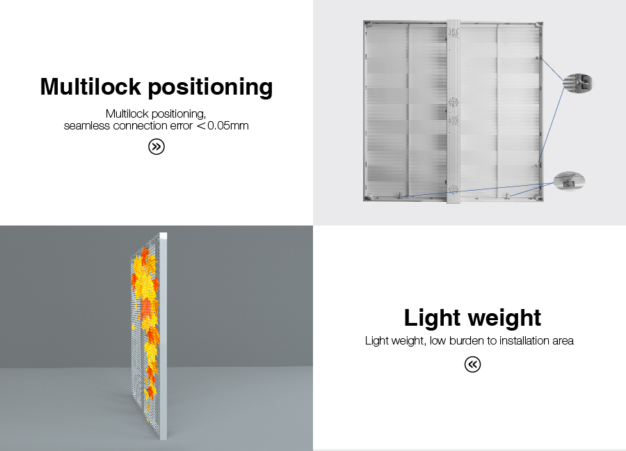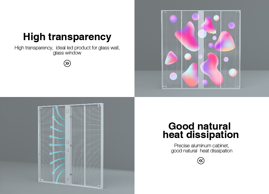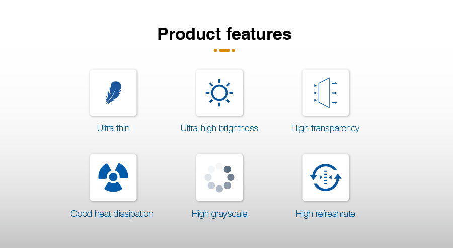 هو خفيف، رقيق وشفاف. الشاشة شفافة ولها أداء جيد في تبديد الحرارة، مما يوفر أكثر من 30٪ من الطاقة مقارنة بشاشات LED التقليدية. وهي تجمع بين الجوانب العملية والجمالية والإخفاء.